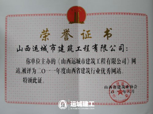 在山西省建筑業(yè)協(xié)會二0一二年通聯(lián)工作會議上,我公司網(wǎng)站被評選為“2011年度山西省建筑行業(yè)優(yōu)秀網(wǎng)站”。 6月6日,山西省建筑業(yè)協(xié)會2012年通聯(lián)工作會在長治召開,會議對我省建筑行業(yè)企業(yè)網(wǎng)站建設(shè)進(jìn)行了評比。參與本次評比的共有90余家建筑企業(yè),有6家企業(yè)獲得山西省優(yōu)秀網(wǎng)站殊榮。