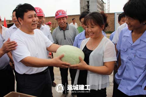 觀摩活動結(jié)束后,公司領(lǐng)導(dǎo)對項目部全體員工進行了慰問,為奮戰(zhàn)在施工一線的廣大員工送去三白瓜、綠豆、白糖、藿香正氣水、毛巾等夏季清涼消暑用品。