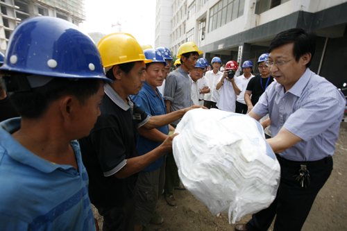 日前,我公司積極響應(yīng)市總工會(huì)號(hào)召,組織開展“關(guān)愛職工.夏送清涼”活動(dòng),為全公司4000余名農(nóng)民工送去T桖衫、毛巾,并為每個(gè)工地送去1000余斤西瓜及其他消暑物品。