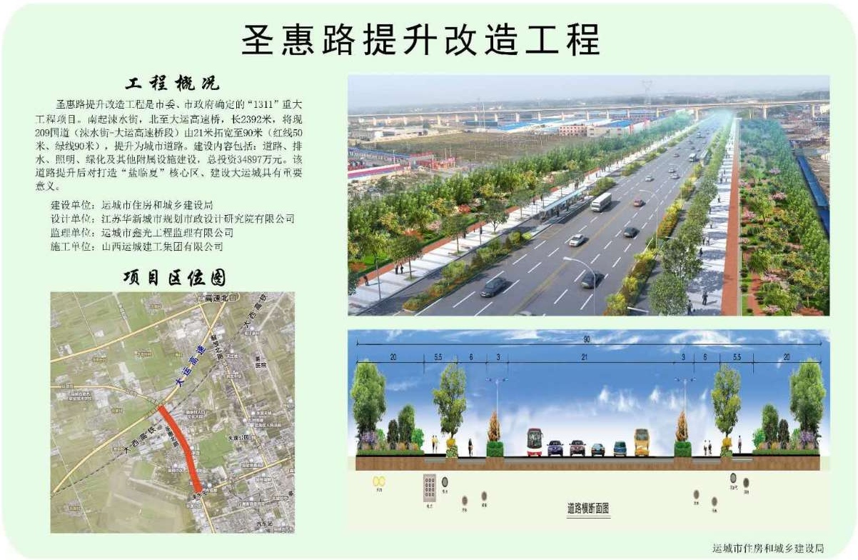 圣惠路提升改造工程是市委市政府確定的城建重點(diǎn)項(xiàng)目,南起涑水街,北至大運(yùn)高速橋,長(zhǎng)2392米,包括道路、排水、照明、綠化及其他附屬設(shè)施建設(shè),總投資43897萬(wàn)元。